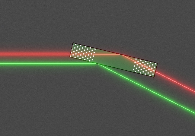 Bit of a dilemma here. Should light passing through a dichroic mirror (prism?) be refracted? Or should it behave as if there was nothing there at all.